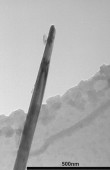 A projection image of ropes of lambda DNA spanning a 2 µm hole. Courtesy of Dr. H.-W. Fink Reprinted with permission from Nature, Nature 398, 407-410, H.-W. Fink & C. Schönenberger, Electrical conduction through DNA molecules (1999), copyright 1999 Macmillan Magazines Ltd. |