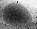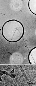 A projection image of ropes of lambda DNA spanning a 2 µm hole. Courtesy of Dr. H.-W. Fink Reprinted with permission from Nature, Nature 398, 407-410, H.-W. Fink & C. Schönenberger, Electrical conduction through DNA molecules (1999), copyright 1999 Macmillan Magazines Ltd. |