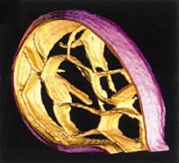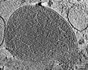 A view of the reconstruction, showing that the crista membrane that forms a three-dimensional network of interconnected lamellae is constantly bound with the inner boundary membrane (both shown in yellow). The outer membrane (magenta) is separated from the inner one by a narrow band of remarkably constant width. Courtesy of Dr. D. Typke Reprinted with permission of Academic Press, J. Struct. Biol. 129,48-56, D. Nicastro et al., Cryo-electron tomography of Neurospora mitochondria (2000), copyright 2000 | |